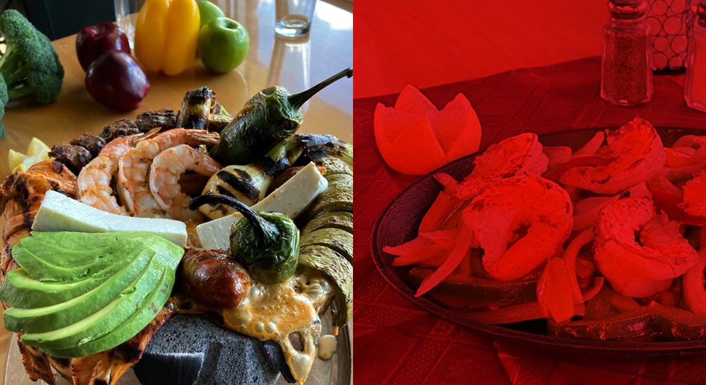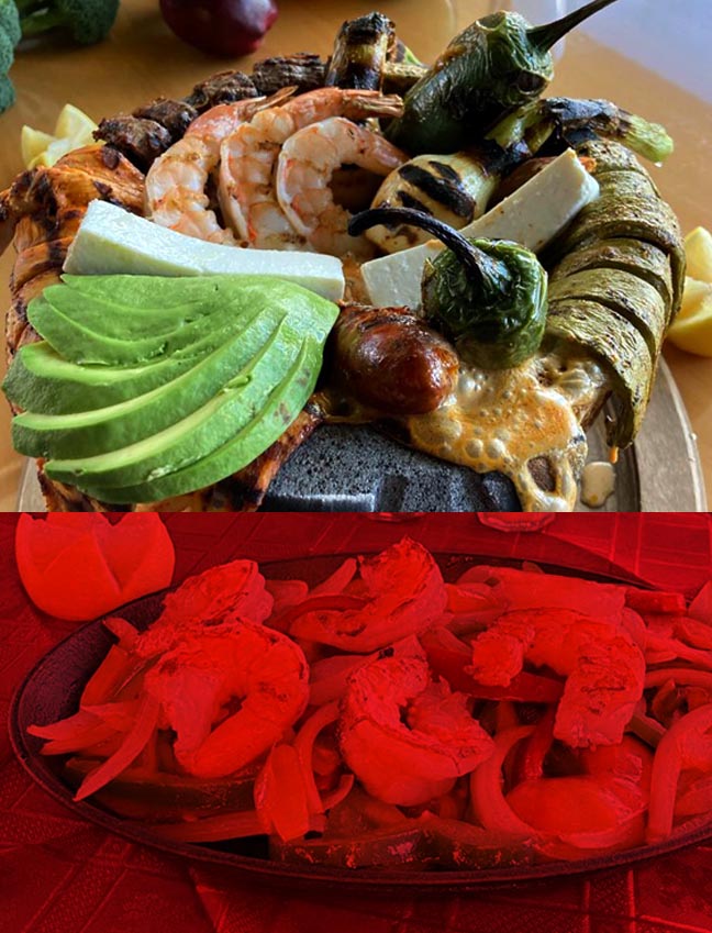*Camarones Fundidos 11.75 Grilled shrimp and sautéed onions served over sizzling melted cheese.